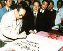 1996年5月15日,中共中央政治局委員、國(guó)務(wù)院副總理李嵐清視察張家界。 前排左二為湖南省人民政府省長(zhǎng)楊正午、左三為本市市長(zhǎng)李剛鋌。攝影/龔建軍