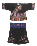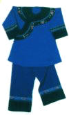 據史載,有關土家族的服飾宋代稱“溪布”、“峒布”、“土錦”等。后受漢族先進技術影響,土家人用自織自染的“土布”做成圍裙。到現代,土家服飾發(fā)生了巨大變化,但仍保留了許多傳統樣式。土家族人始終著以琵琶襟為特征的滿襟衣。托肩矮領大袖口,滾花邊。男捆腰帶,女套繡花圍裙。頭上均包青布帕或絲帕,男帕左方垂一節(jié)過耳,婦女全包頭。未婚閨女留長發(fā)扎辮,用紅頭繩扎上下兩端,額前前留“劉海”。已婚婦女挽上發(fā)管,別簪,插銀首飾。褲子多為青、藍色、上結白布褲腰,褲腳短且大。青壯年男子打綁腿,女褲以對襯色布加邊,上綴三條均等的梅花條,腳上穿青布瓦鞋,包白色裹腳布。若遇喜慶節(jié)日或走親訪友,則另有一番梳妝打扮,如加佩牙簽、銀牌等。