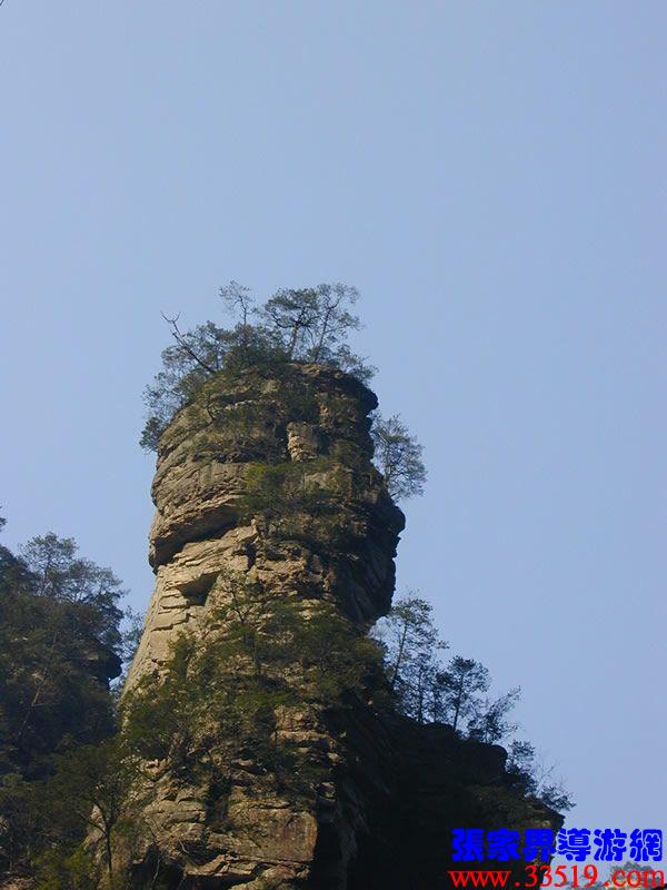 (金鞭巖、神鷹護鞭)如果要問張家界國家森林公園的標(biāo)志景點,答案是現(xiàn)成的:金鞭巖。早在清代中期,一些文人就把張家界的峰林及百丈峽列入“永定八景”。其一叫“危峽啼猿”;其二叫“層巖涌塔”:“縣西二十里青崖山,其前五山并立,層峙如浮圖。中一峰更峻拔,上插宵漢,晴輝雪積,最擅奇觀。”這里說的“其中一峰”,指的金鞭巖。八大景點張家界占其二,可見先人是有眼力的。金鞭巖相對高度380多米,拔地而起,直插云霄,無論你遠(yuǎn)看近看,正看側(cè)看,都是一根刺破青天的長鞭!在金鞭巖左側(cè)的那座巖峰,大家看多像一只兇猛的老鷹,勾嘴瞪眼,雙翅略展,時刻警覺地守護著金鞭,人稱“神鷹護鞭”。