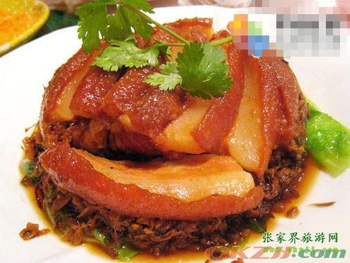 “土家扣肉“是《張家界》土家人待客的一道主菜、和豬肘子齊名。一般只有在當(dāng)?shù)氐娜宿k酒席或大型活動的時候才會上用作主菜。土家扣肉的做法均采用五花豬肉,經(jīng)過煮、炸、蒸等多道工藝制成,上席時肉的下面一般都會用干咸菜(或者豆豉)鋪底。 |