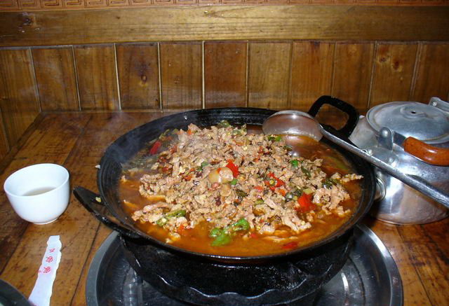 午餐/晚餐 首先推薦張家界的特色菜——三下鍋。 《三下鍋》,所謂的三下鍋其實就是一種很方便的干鍋,它是由三種主料做成的,燉著不放湯的火鍋。“胡師傅三下鍋”就很有代表性,三下鍋15元/份,分量很夠吃的,包你吃夠吃好!推薦的就是干煸腸子,干煸核桃肉和湘西臘肉三種混在一起燉,吃的同時還可以點一份酸蘿卜,又脆又酸。真的是極品哦!