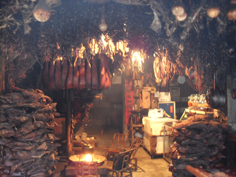 如果你想品嘗正宗的煙熏臘肉,還非得在張家界景區(qū)內(nèi)吃。在景區(qū)內(nèi)當?shù)厝碎_的小飯館里可以吃到被炭火烤得烏黑的香噴噴的臘肉,只要把外層洗掉就行了。這種臘肉在城里是不可能吃到的,它是在農(nóng)家的灶上慢慢烤出來的。