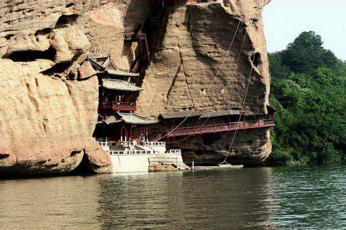 水巖在旱仙巖北面,靠上清河兩岸,因臨水而名,以碧水丹山而聞名遐邇,主體在西岸。要主景點(diǎn)有古棧道遺址、飛云閣、棋盤石、“仙女獻(xiàn)花”、仙梳石、金鐘峰、仙勺石、雌雄石等。怪石奇巖,滿山紛陳,隨處是景,目不暇接。從龍虎山莊附近乘船行不遠(yuǎn),對(duì)岸即是水巖,只見(jiàn)崖壁貼岸,陡立如屏,古樹(shù)橫生,藤蔓垂掛,山崖上古棧道遺址依然存在。在崖壁上有許多名人題刻,如“玉壁凌空”、“半天仙跡”、“神仙可接”等。至一峽口上岸,左側(cè)即絕壁獨(dú)立的“仙女獻(xiàn)花”。沿山徑上山,一路美景不斷。對(duì)岸亦是高峰聳立河邊,上清河蜿蜒中間,青山碧水,幽景迷人。