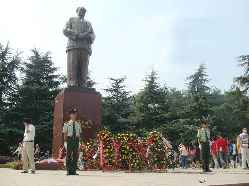 毛澤東銅像重3.7噸,像高6米,基座高4.1米,通高10.1米,象征著“10.1”國慶,更象征著毛澤東是新中國的締造者。像面朝東南方,身著中山裝,左胸前掛著“主席”證,手執(zhí)文稿,目光炯炯,面帶微笑,正視前方,巍然挺立,成功地再現(xiàn)了人民領(lǐng)袖毛澤東出席開國大典時(shí)的風(fēng)采。銅像褐紅色大理石基座正面,鐫刻著中共中央總書記、國家主席、中央軍委主席江澤民1992年題寫的“毛澤東同志”五個(gè)貼金大字。
