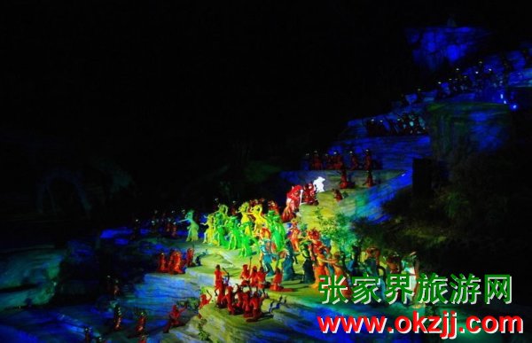 是目前世界第一臺(tái)有完整故事情節(jié)的山水實(shí)景音樂(lè)歌舞劇。舞臺(tái)選址在天門山風(fēng)景區(qū)山門口內(nèi)至天門山頂?shù)恼麠l峽谷,總投資達(dá)到1.2億元,演員隊(duì)伍達(dá)530多人。主舞臺(tái)以10000平米的玻璃鋼打造,是目前世界最大的全景玻璃鋼舞臺(tái)。
