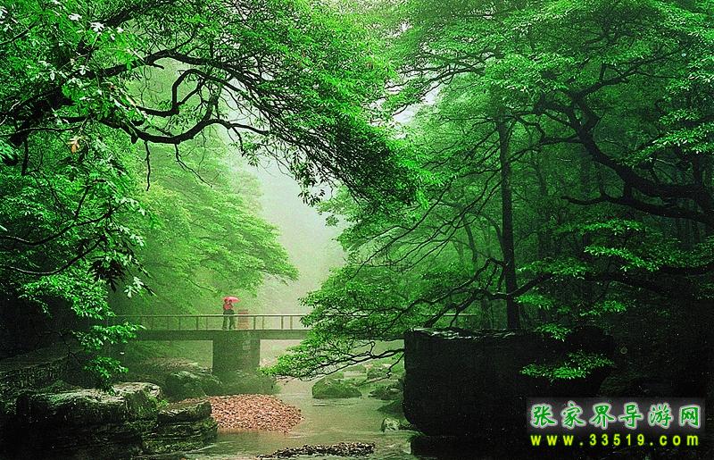 沿著金鞭溪往上游走,兩邊是高聳挺拔的巖峰,淙淙的流水一直陪伴著你,雨后的空氣如同滌洗過(guò)一般,夾帶著那種山里特有的香草味清新而又甜美,不時(shí)飄灑過(guò)來(lái)一陣細(xì)雨露水,真使人舒服極了。走不多遠(yuǎn)就是美麗恬靜的“紫草潭”,來(lái)自金鞭溪與砂刀溝的兩條溪水在這里匯合,一起向東流去。墨綠的溪水流在紅色的沙巖上,煞是好看。這里有低瀑,有淺灘;成片的銀花飛濺,碎作千杯瑞雪。潭上一棵函大的楠木,如一把巨傘覆蓋在潭上的石板橋上,顯得那么清涼而悠閑。