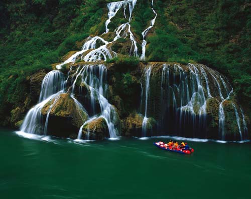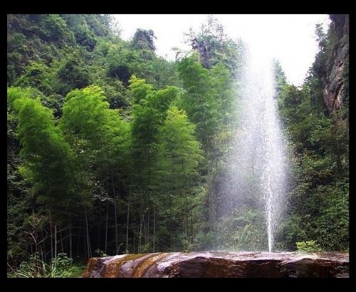 在金鞭溪游覽過程中,可見一組奇峰,有兩座較高的石峰緊密相連,下半截連為一體,上半截一高一矮,高者略欠身,低者稍后仰,好一幅相愛擁抱的絕妙畫面,恰似一對久別重逢的夫妻,故名相會峰,亦稱千里相會。相傳東海龍宮小龍女常來此地觀賞風(fēng)景,一次偶然的機會,結(jié)識了峨眉山遠(yuǎn)道而來的后生,二人情投意合,很快便產(chǎn)生了愛情。龍王知道此事以后,非常惱怒,決意拆散二人,多次將小龍女關(guān)在龍宮,但小龍女想方設(shè)法逃出來,常常與情人相會。龍王一氣之下,將二人點化成石,便成石峰“千里相會”。 十一、茅巖河漂流